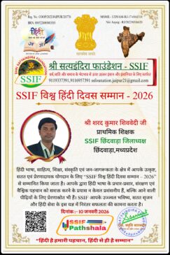 विश्व हिंदी दिवस के उपलक्ष में श्री सत्यइंदिरा फाउंडेशन जयपुर, राजस्थान के द्वारा शिक्षक शरद कुमार शिववेदी शासकीय हाई स्कूल बरेलीपार,विकास खण्ड जुन्नारदेव, जिला छिंदवाड़ा को “विश्व हिंदी दिवस सम्मान 2026” से सम्मानित किया गया है.
