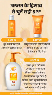 - SPF 30 लगभग 97% तो SPF 50 करीब 98% UVB रेज से बचाते हैं यानी फर्क बहुत कम होता है।